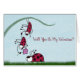 In this painting, this cute ladybug is being held onto by another as he presents a flower to his sweetheart. The one ladybug that is holding onto him is clinging to a blade of grass. Blue skies all around and green grass. Make this greeting card your own by adding your own text, or delete it to leave blank. Based on an original art piece by © One Artsy Momma.
