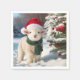 The image depicts a charming, wintry scene with a white lamb as the main subject. The lamb, adorned with a red Santa hat and a green scarf, looks directly at the camera, standing in a snowy field. To the right of the lamb, a snow-covered Christmas tree can be spotted. The overall image depicts a festive, joyful ambiance, resonating with the spirit of Christmas.