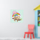 A colourful rainbow behind him along with a pink sun hovering over head. Cute, adorable and trendy.