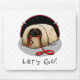 Let's Go! (for a walk) Pekingese (brown masked Peke) - Cute dog cartoon with a red leash and collar in his mouth, ready to go do something...go for a ride, go play, go for a walk, on a vacation, anywhere! Copyright © Angi Laframboise. Funny dog breed and dog obedience training themed gifts for dog lovers.