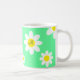 This adorable mug features white flowers with a soothing light green background. Single initials for personalization can be placed in the centre of a flower on front and back. It's a sweet and happy cup to use for beverages.