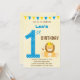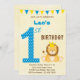 Birthday invitation with cute lion theme and blue, yellow and brown colour combination.
