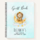 Baby shower spiral guest book with a cute watercolor illustration. An adorable lion wearing a crown fishing for stars sitting on a crescent moon resting on a fluffy cloud. Magical fantasy illustration. Light blue watercolor background.