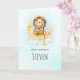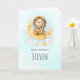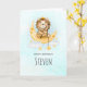 Birthday card with a cute watercolor illustration. An adorable lion wearing a crown fishing for stars sitting on a crescent moon resting on a fluffy cloud. Magical fantasy illustration. The bottom of the card has a border of gold stars. Light blue watercolor background.