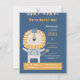 Funny play-on-words "We're Not Li-on!" party invitation in a smaller size for a little boy's one-year-old birthday featuring a proud lion with a blue crown wearing a rainbow shirt in shades of orange-gold and blues with text in matching colours on a dark blue background. The reverse side is a lovely gold-orange. Fill in your own information in the template fields provided.