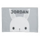 This design features cute little bunny rabbit with personalized name in grey modern sans serif font style on light grey background.