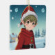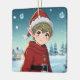 Cute adorable little elf sitting outside on a winter day. personalized Christmas ornament for a boy.