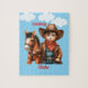 Saddle up with this cute puzzle featuring a charming little cowboy with a hat and red bandana. He's surrounded by his adorable animal friend a friendly brown and white horse with a blue background, can be personalized with any boy's name you would like.