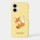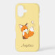 Cute little cartoon fox kit with large ears and bushy tail is watching a fluttering butterfly.