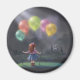 A cute little girl wearing a pink shirt and blue skirt stands holding five colourful balloons. She is bringing a patch of brightness to a dark world. In the distance is a grey building surrounded by mist and dark trees and mountains.