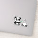 A pair of cute cartoon pandas. The left panda is holding a bamboo stick watching the right panda who has fallen asleep.