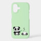 A pair of cute cartoon pandas. The left panda is holding a bamboo stick watching the right panda who has fallen asleep.