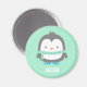 A magnet with a cute little penguin with a green stripes winter scarf and a pair of blue ice skates. Mint background colour can be changed. Great as a mini gift or Christmas stocking fillers! Personalise with child's name.