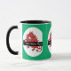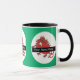 Une tasse de Ringer verte et blanche avec une lèvre et une poignée noires et trois mignons petits dragons rouges tenant place pour ajouter le nom du propriétaire.