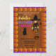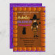 An adorable children's Halloween costume party invite, featuring a cute little girl in witch's costume, complete with big witch's hat and orange striped leggings. She has her pet black cat nearby, plenty of orange pumpkins, purple glitter and even a spider hanging down on a web from above. The back features the little girl with her cat and pumpkin on a colourful background of purple glitter.