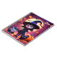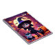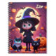 This notebook features a cute little witch in a black costume with cats and pumpkins on Halloween night.
