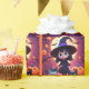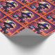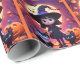 This wrapping paper features a cute little witch in a black costume with cats and pumpkins on Halloween night.