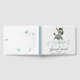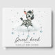 Cute baby shower or birthday guest book featuring adorable little male zebra with some blue love hearts