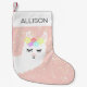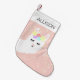Adorable trendy design with front of stocking background in pastel pink stars and white llama face on the center. She has pretty flowers on top of her head and long eyelashes. Name is in dark grey