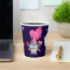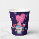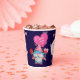 These are fun Valentine's Day party paper cups that can easily be adapted to other celebrations, such as engagement parties.They feature a funny white bearded little gnome dressed in blue and pink, and holding a red rose and a pink heart. Above the gnome is a large pink heart that says "Love is in the air". The image is printed on two sides, with a circle banner between them that holds your custom text. Everything is placed on a navy blue background with scattered lavender and light pink hearts.