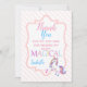 A pretty cute girly unicorn design for a little girl's Magical birthday party with a pale pink decorative frame with a unicorn which has a colourful tail and mane of rainbow colours of pink , purple, blue and yellow. The word Magical is also in a colourful font of rainbow colours. The background has a pale pink stripped pattern. an be customized by changing the Thank you message then personalize with your child's name . Have a wonderful party. Matching party items available.