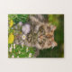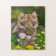 A young lovely brown tabby Maine Coon kitten sitting curiously in a flowery meadow in spring. A cute coonie cat photo taken by Katho Menden. This animal photo puzzle game is a gift idea for cat lovers. http://www.zazzle.com/kathom_photo