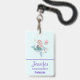 Name badge with an adorable illustration. Designed with a pretty mermaid girl riding a happy dolphin. A little jellyfish friend accompanies them. Decorated with little splatters of faux gold glitter. Light blue background with faded pink polka dots.