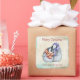 A cute Christmas stickers personalized with your name and Merry Christmas. Designed with an adorable illustration of a penguin couple cuddling together. Wearing winter scarves and hats. Set on a cream coloured vintage background with turquoise accents along the edges.