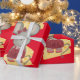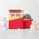 Very Cute and very cheesy Mouse family sitting on a cheese pattern, mom, dad, son and daughter each on their slice of cheese, Plain festive and playful red background