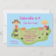 Start your celebration off with this adorable golf party invite. It is for a girls golfing party. it features a brunette haired girl at the edge of a putting green and a blonde haired girl in pig tails ready to put the ball. There are two holes with flags on them that they are aiming for. Look for the many other products in this line. ©Jessica Weible Illustrations