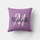 Throw pillow with a purple background and white custom monogram first initial and first name.