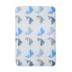 Modern whale illustrations in shades of blue on pastel blue bath mat.