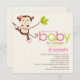 Start your safari baby shower off right with our sweet jungle monkey baby shower invitation. Our monkey shower invitation features the sweetest little monkey with a flower swinging on a tree branch set on a beige stripe background with a monkey coordinating back. Visit our shop to view our matching thank you note cards, postage and stickers. ©Petit Tatti