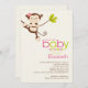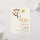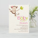 Start your safari baby shower off right with our sweet jungle monkey baby shower invitation. Our monkey shower invitation features the sweetest little monkey with a flower swinging on a tree branch set on a trendy brown background with a monkey coordinating back. Visit our shop to view our matching thank you note cards, postage and stickers. ©Petit Tatti