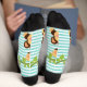 Add some playful charm to your wardrobe with these adorable socks featuring a cute monkey swinging on a vine against a backdrop of turquoise stripes. These socks are perfect for adding a fun touch to your outfit, whether you're lounging at home or stepping out. Made from soft and durable materials, they ensure comfort and style all day long. These socks make a delightful gift for animal lovers or anyone who enjoys a bit of whimsy in their wardrobe.