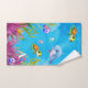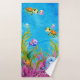 Cute under-the-sea beach towel featuring jellyfish, starfish, sea turtles, and dolphins. Perfect for a nautical ocean-themed kid's bathroom.