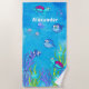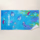 Cute under the sea beach towel featuring a jellyfish, starfish, sea turtle. fish & crab. Perfect for a nautical ocean-themed kid's bathroom.