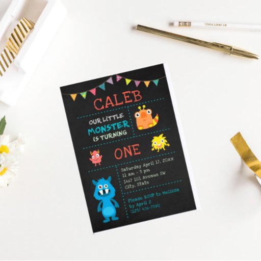 A first birthday monster theme invitation on a chalkboard background. You can change the age number as well. This isn't just for first birthdays!