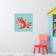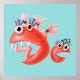 Funny monster poster with a dynamic digital illustration of two happy creatures with odd shapes - one big and one small - standing next to each other and smiling. The big one has three ponytails and is smiling happily showing its sharp teeth. Its little friend has a funky hairstyle of just three hairs.