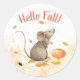 A cute watercolor mouse surrounded by fall leaves and a pumpkin.