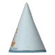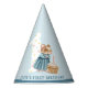 Celebrate your child's first birthday with this cute mouse birthday party hat. The design features a mouse blowing out a candle on a birthday cupcake. The background is a subtle light blue pattern. You can personalize this party hat with a name.