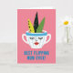 Designed with a bright, modern illustration style, the card centres on a white mug with soft blue vertical stripes and a strong blue rim. The mug has closed eyes with long lashes and a small red smile, giving it a sweet, affectionate look that feels like a quiet crush ❤️. Three leafy shapes rise from the mug like a friendly bouquet: one is lime green with black round spots, one is very dark green with muted grey-green dots, and one is a solid medium green for balance. The background is a strong bubblegum pink that makes the mug and leaves stand out and adds a flirty, cheerful energy. Near the bottom, a short message sits centred in thick blue letters, acting like a steady anchor under the picture. The simple shapes and close grouping suggest a cozy closeness, like a small gift shared between friends 🌼. The red smile and the blue rim draw the eye first, while the spotted leaves fan upward against the pink field.