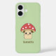 A green phone case with an illustration of a cute mushroom in cartoon style and customizable text below! It could be perfect for a kid or a friend who loves Kawaii character and nature!