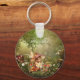 A cute fairy wearing a red mushroom hat talks to a small butterfly while sitting quietly on a log in the forest. She is surrounded by red and white spotted mushrooms and white daisies.
