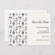 Save the date postcard with a musical themed design. A pattern with treble clef, bass clef and other musical symbols.
