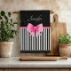 Black and white kitchen tea towel featuring a cute girly pink bow and ribbon on a black and white stripes pattern and personalized white name print.