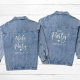 Celebrate in style with this Cute Nashville Bachelorette Party Denim Jacket! Perfect for the bride's bridal party and friends, this trendy jean jacket features “The Party” in a stylish white modern script with a customizable location underneath — ideal for girls’ weekends, destination bachelorettes, or pre-wedding festivities. Whether you’re celebrating in Nashville, Vegas, or Charleston, it’s the ultimate keepsake for the bride and her best friends. Pair it with your favourite dresses, leggings, or matching bridal party outfits for a photo-ready look that’s effortlessly chic. A coordinating "Wife Of The Party" jacket is available for the bride.