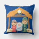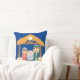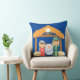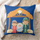 cute Nativity scene on a blue background with baby Jesus in a manger and Mary and Joseph standing and sheep at their feet