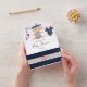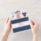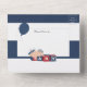 Trendy nautical boy baby shower invitation with accents of blue, white and red.