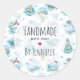 Handmade with love stickers with a whimsical pattern featuring cute smiling whales happily swimming in the sea.